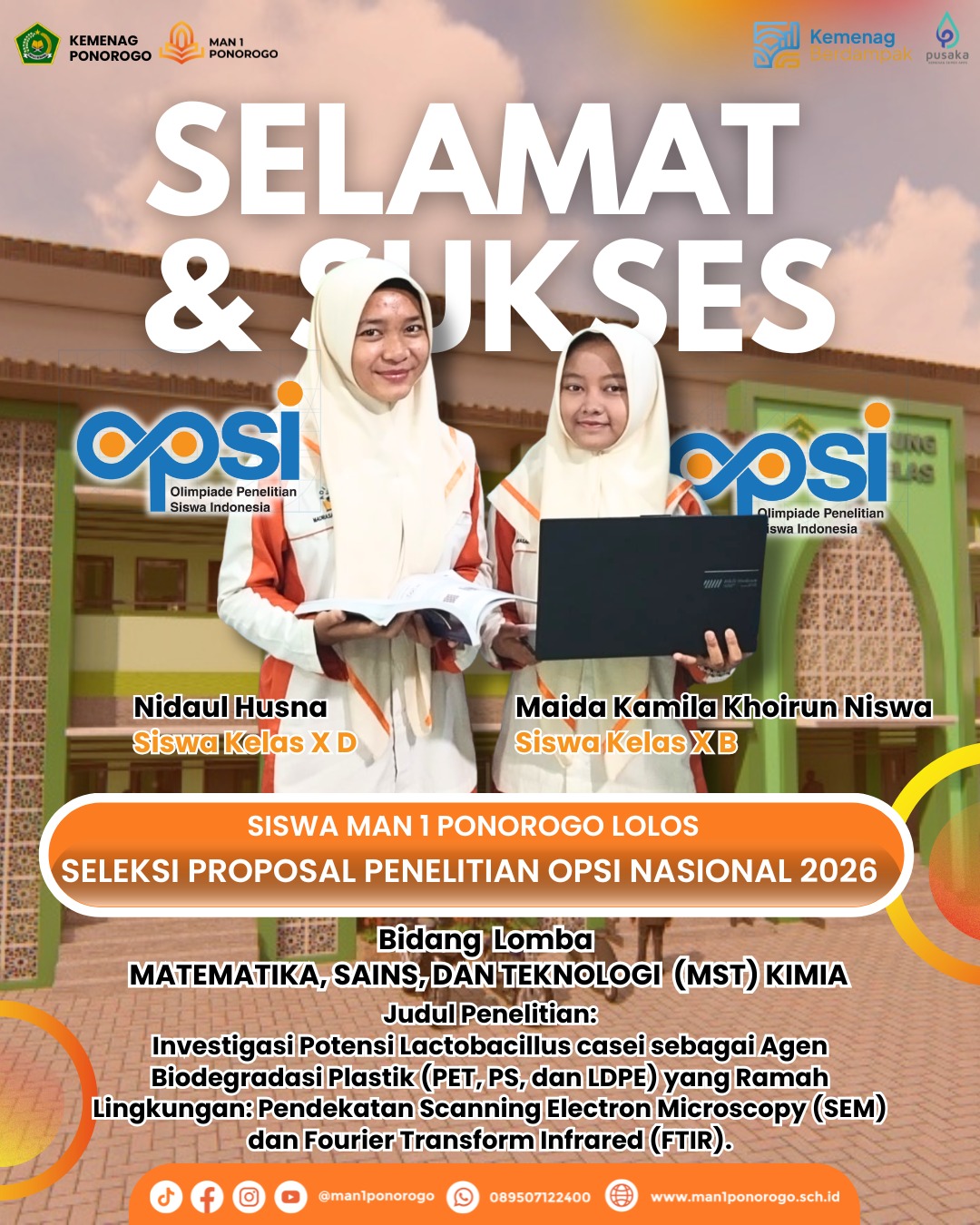 Ponorogo, 02 Maret 2026 - Dalam rangkaian kegiatan Pondok Romadhon, MAN 1 Ponorogo menggelar acara safari pelajar yang merupakan program pembinaan remaja/pelajar oleh Majelis Ulama Indonesia (MUI) Kabupaten Ponorogo. Kegiatan yang berlangsung di aula ini menghadirkan pemateri utama, Dr. Iswahyudi, M.Ag., yang juga menjabat sebagai Ketua Komisi Kerukunan Umat Beragama MUI Kabupaten Ponorogo. Dalam sesi pembinaan tersebut, Dr. Iswahyudi didampingi oleh Ibu Sumarah dari Komisi Pemberdayaan Perempuan, Remaja, dan Anak (PPRA) MUI Ponorogo. Acara ini dirancang khusus.....