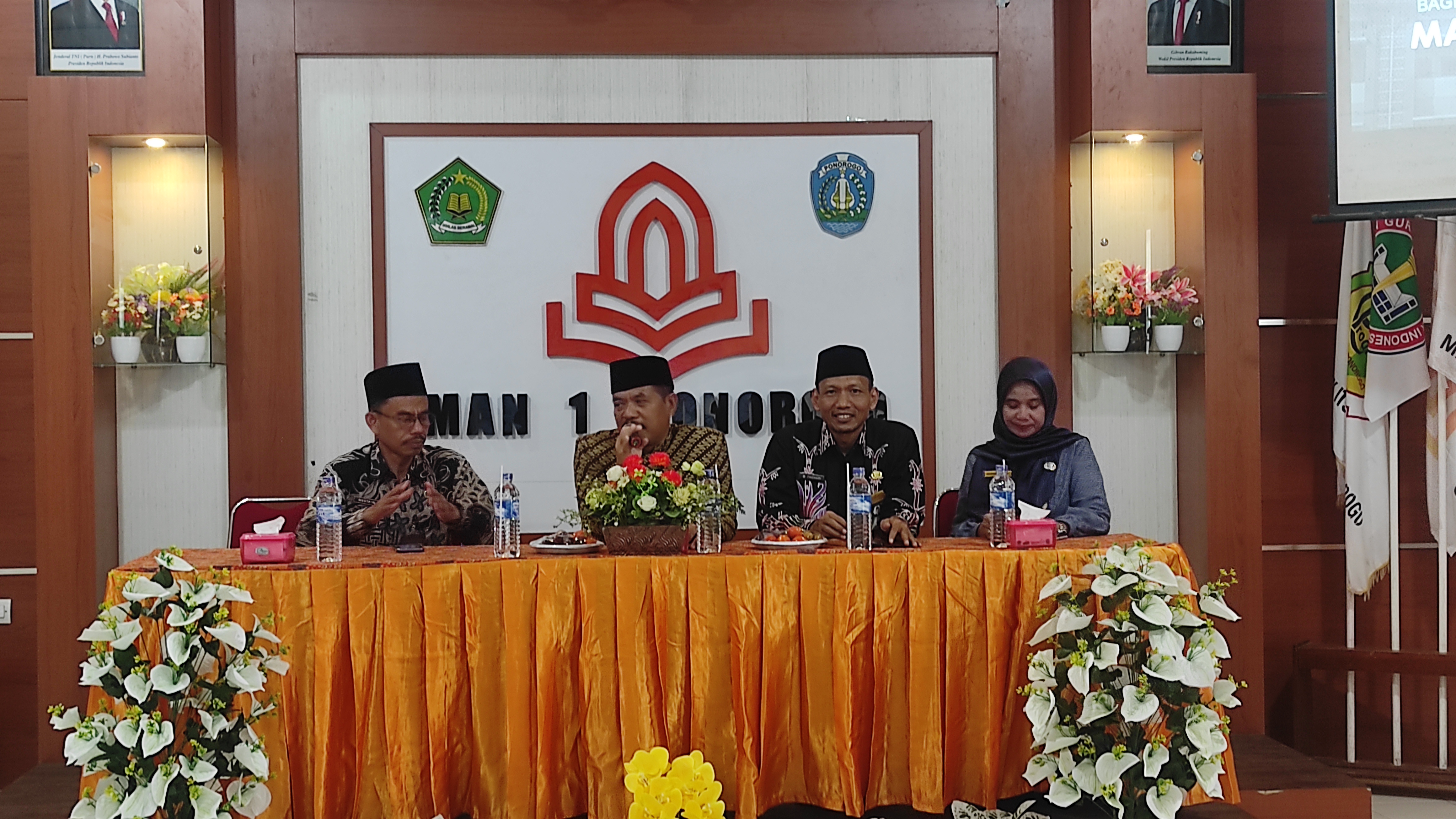 Ponorogo, 16 Juni 2025 - Madrasah Aliyah Negeri 1 Ponorogo menyelenggarakan Workshop Moderasi Beragama bagi siswa kelas XI pada Senin (16/6/2025). Kegiatan yang bertempat di Aula Graha Wiyata ini bertujuan membekali peserta didik dengan nilai-nilai toleransi dan keseimbangan dalam menyikapi perbedaan di masyarakat......